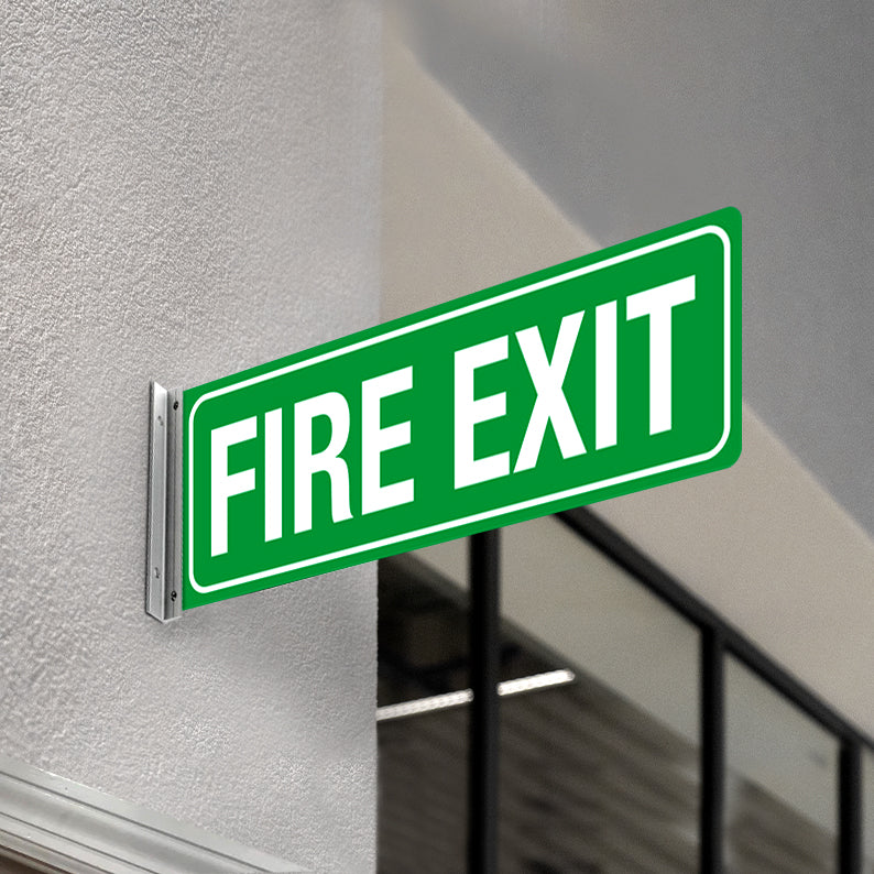 The projecting, double-sided format ensures the FIRE EXIT message remains visible from multiple directions, improving response time and supporting safe evacuation.